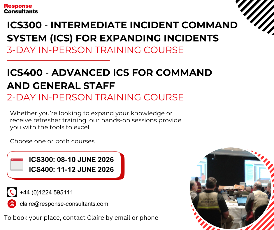 Our next ICS 300 & 400 Open Courses are being held on 08-10 June 2026, followed by ICS 400 on 11-12 June 2026. For more information, please contact Claire